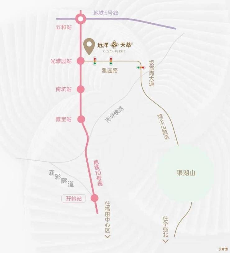 项目交通十分便利,楼下的光雅园站有地铁坂田线(10号线),南北走向通达福田至龙岗平湖,当中路过福田中心、华为一带产业聚拢区都是不少大厂人的通勤必经之路,还能直达福田口岸到香港。1站到五和枢纽站可换乘环中线(5号线)/ 深大城际,3站到贝尔路站可以转25号线,4站直达华为站。2站到坂田最大商业核心区星河World,3站到福田梅林,6站到福田岗厦北枢纽。