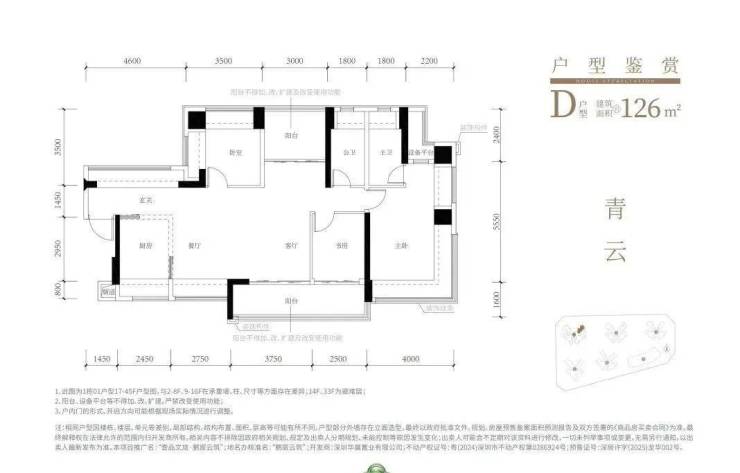 126㎡的4房2厅2卫,设计的是横厅南北通透格局,进门赠送约4.2㎡的入户玄关,客餐厅6.35米开间,4个卧室分别做到了主卧21.37㎡/次卧10.22㎡/次卧10.19㎡/次卧7.39㎡(实测面积,去掉墙体),主卧+1个次卧270°飘窗,客厅连接次卧出6.3米长大阳台,L型厨房,得房率约103.5%(包含赠送),阳台主朝东南向。
