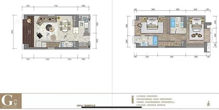 ★88㎡复式两房两厅三卫 双向通透采光,5.4米开间客厅及主卧,双套房周全设计,室内多变空间可根据家庭需要设置独特的功能。