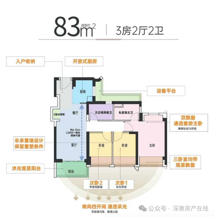 4开间东南向采光,赏碧道公园、看园林景观,主卧室通透双面采光,收纳更轻松,S型墙体设计冰箱位,空间利用更合理,2个卫生间方正格局,有飘窗更省空间。