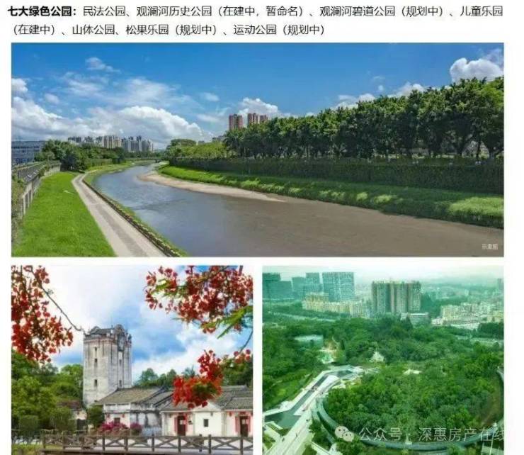 一河七公园:观澜河,民法公园、观澜河历史公园(在建中,暂命名)、观澜河碧道公园(规划中)、儿童乐园(在建中)、山体公园、松果乐园(规划中)、运动公园(规划中);