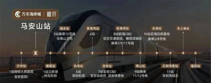 这次海岸城檀府距离11号快线马安山站直线仅300m,5站到机场,7站到宝中。换乘1号线还可通勤南山科技园、后海、福田中心和车公庙等。