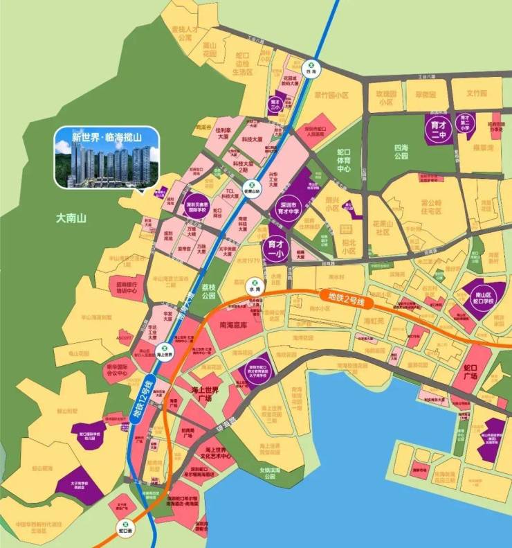 新世界临海揽山御园位于南山蛇口工业五路与沿山路交会处,占地面积近4万㎡,总建筑面积约30万㎡。