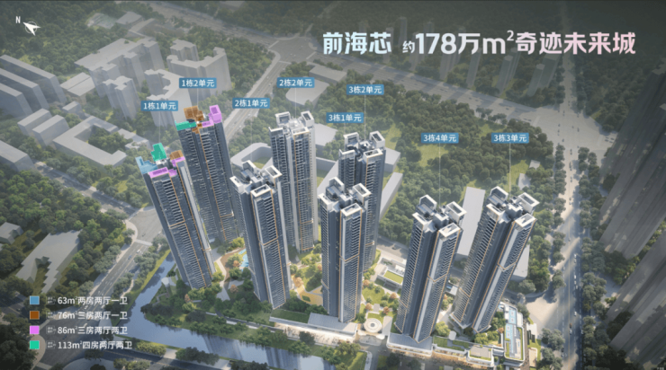 前海未来城一期,总占地面积约4.51万㎡,总建筑面积约31.25万㎡,计容建筑面积约24.95万㎡,容积率4.77,绿化率35%,共由8栋45-47F住宅组成,分ABC区建设,其中A区1栋1单元47F,1栋2单元46F,B区2栋1单元47F,2栋2单元46F,C区3栋1/2/4单元47F,3栋3单元45F,4栋是1所9班制幼儿园。
