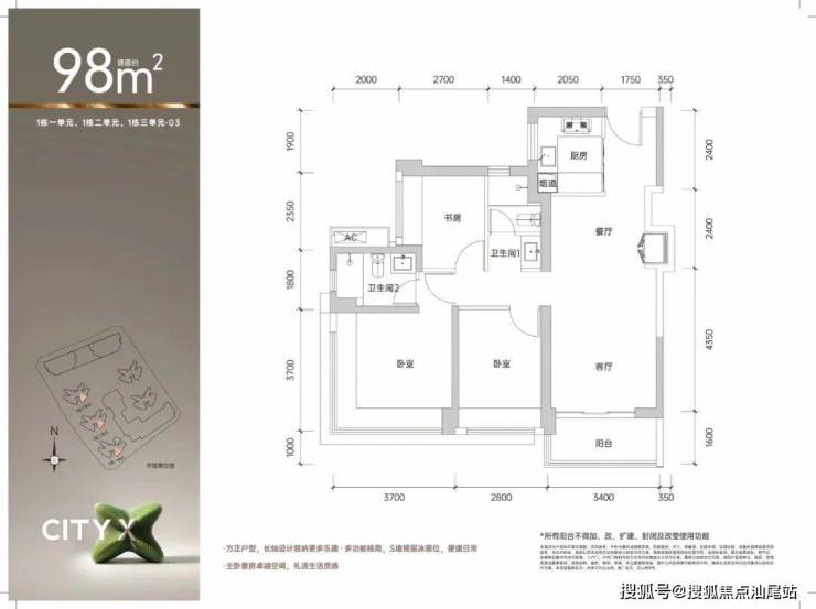建面约98㎡三房两卫:这款户型更侧重于居住的舒适度与品质感。客餐厅及主要卧室多采用南向布局,确保了充足的采光与优良的通风。公卫巧妙地实现了干湿浴三分离,是对家人生活习惯的细致体贴。