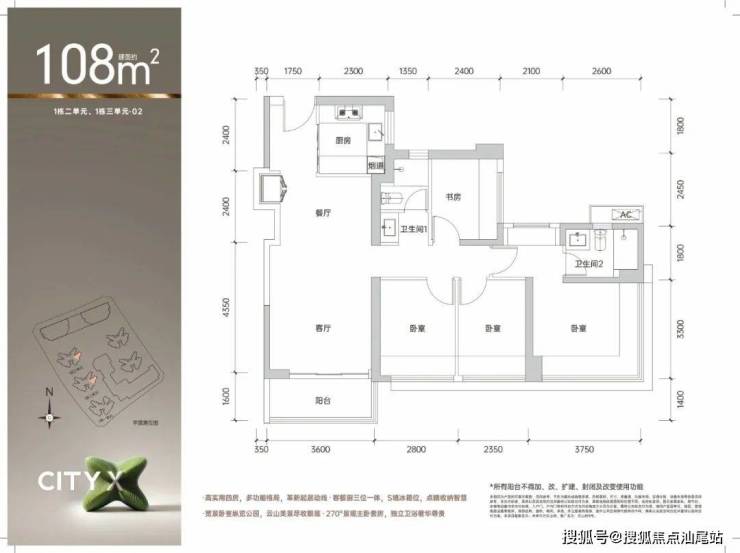 建面约108㎡四房两卫:为改善型家庭量身打造。全明设计确保了每一寸空间的通透与明亮,约3.6米开间的大尺度阳台,不仅延展了生活空间,更将室外的景观与活力引入家中,是家庭品质升级的理想选择。