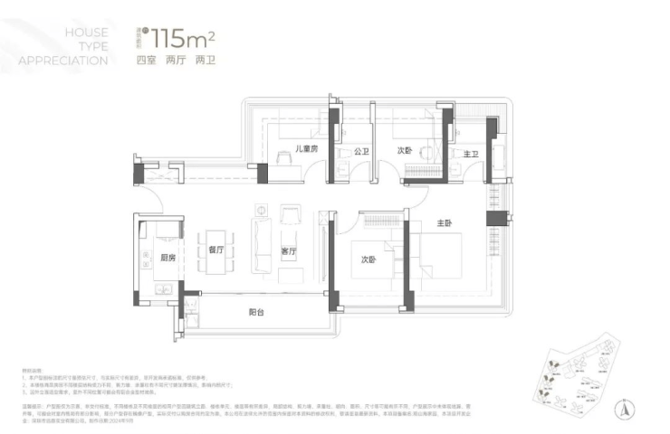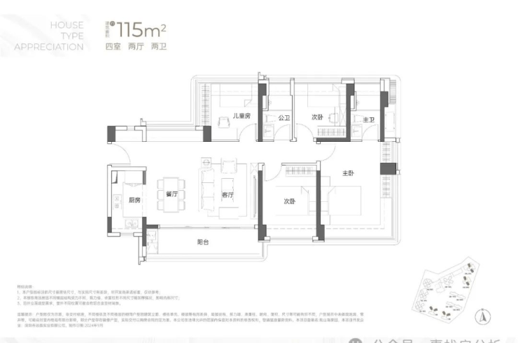 115㎡的4房2厅2卫:横厅南北通透格局,客餐厅6米开间,LDKB一体化,全屋飘窗,4个卧室分别做到了3.9米/3米/2.8米/2.6米的宽度,主卧加1个次卧270°全景飘窗,客厅出6米长的大阳台,L型厨房,得房率约95-97%(包含赠送),西南或东南朝向。115平米户型分布在1栋1单元、1栋2单元、1栋3单元01/02户型,01户型西南朝向都是看小区外围,02户型看向小区;