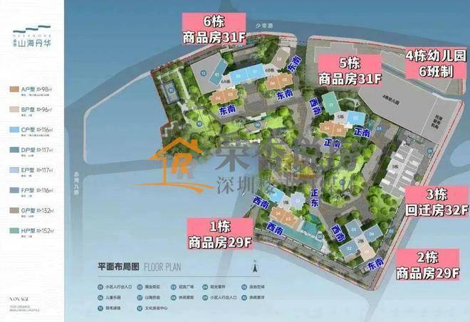 其中1/2栋商品房29层,3栋回迁房32层,5栋/6栋A/B座商品房31层,4栋是1所6班制幼儿园。