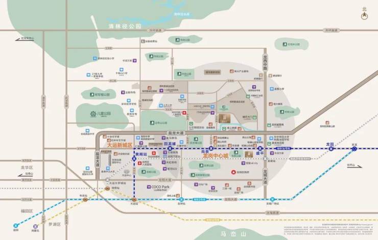 拥抱龙岗中心绿核,比邻回龙河绿道,近享回龙铺公园、证券山公园、将军帽公园、龙潭公园等周边十园环抱,临河而居,于自然与繁华间,独处亦安澜。