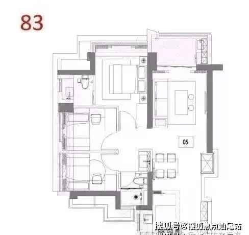 83㎡的3房2厅1.5卫,设计的是竖厅格局,进门入户玄关,LDKB一体化,S墙设计预留冰箱卡槽位,U型厨房,主卫少了淋浴,公卫三段式分离,得房率约92%(包含赠送),阳台西北朝向。