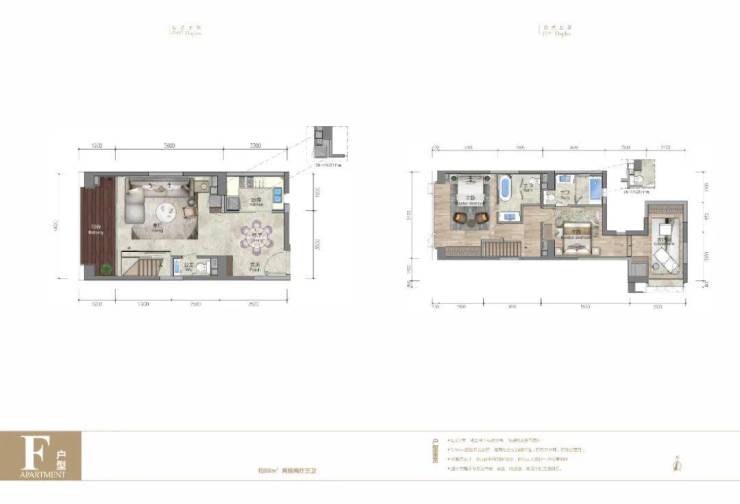 F 户型面积约 88㎡,是一个两房两厅三卫的布局,同其它户型一样,楼下规划出客厅、餐厅、厨房及卫生间,楼上则是双主卧套房。