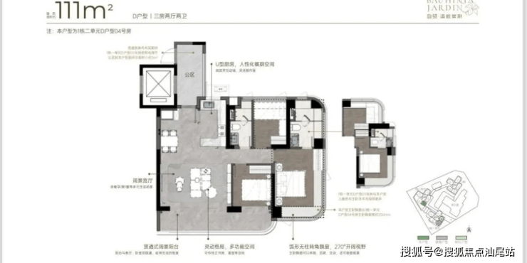 111m²三房两厅两卫的D户型:竖厅格局,得房率约92-100%(含赠送),朝向为西南或东南。