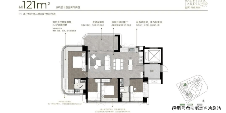 121m²四房两厅两卫的B户型:采用横厅南北通透格局,得房率约92-100%(含赠送),阳台主要朝向西南或东南。