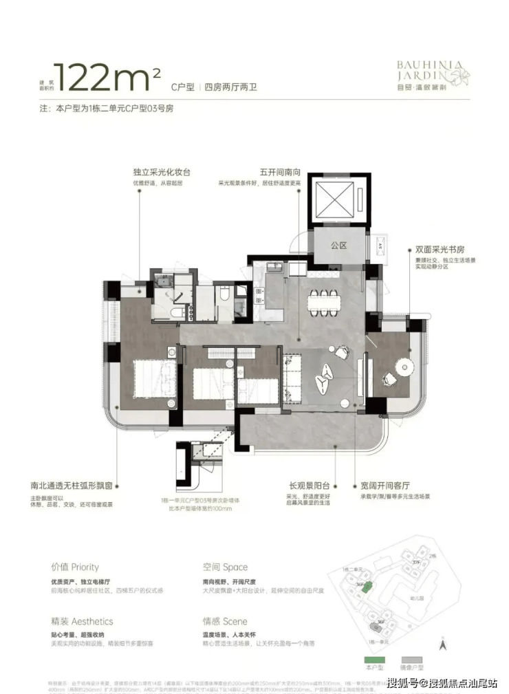 122m²四房两厅两卫的C户型:双龙抱珠户型,得房率约92-100%(含赠送),朝向为西南或东南。