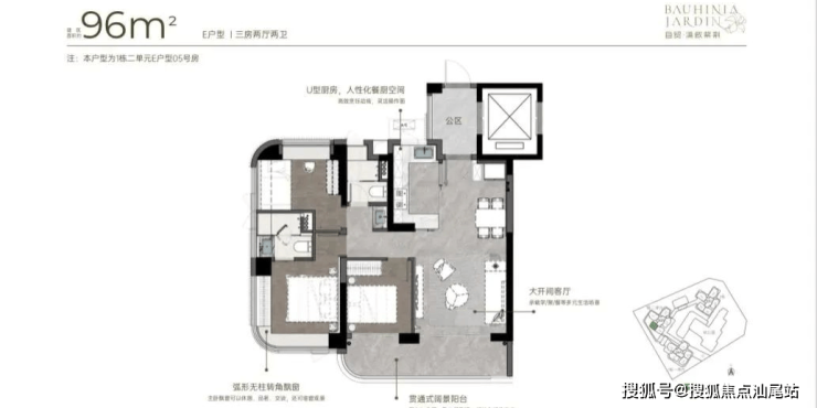96m²三房两厅两卫的E户型:竖厅格局,拥有超宽客厅,LDKB一体化设计,动静分区。三开间朝南,得房率高达92-100%(含赠送部分)