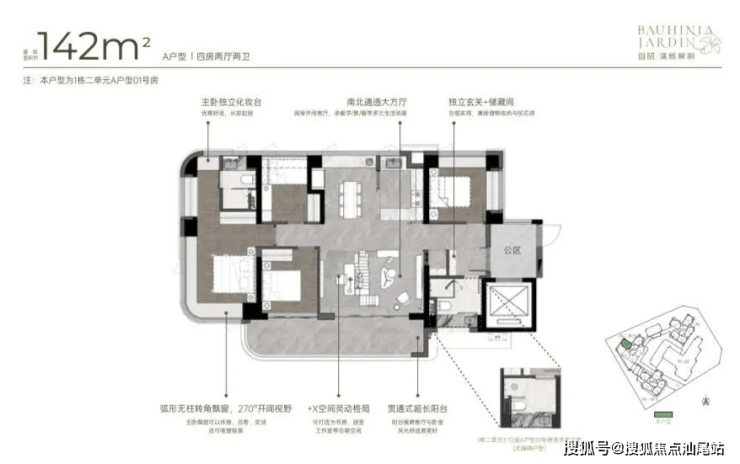 142m²四房两厅两卫的A户型:双龙抱珠户型,得房率约92-100%(含赠送),朝向为西南或东南。