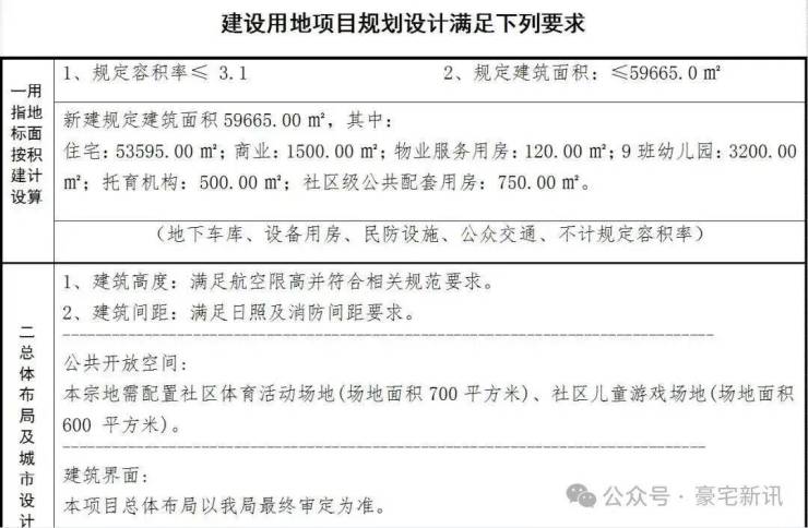 根据规划设计要求,地块占地面积19246.94㎡,规定容积率≤3.1,建筑面积59665㎡,包括53595㎡住宅,1500㎡商业,住宅和商业允许分割转让;另有还规划有3200㎡9班幼儿园,以及500㎡托育机构等。