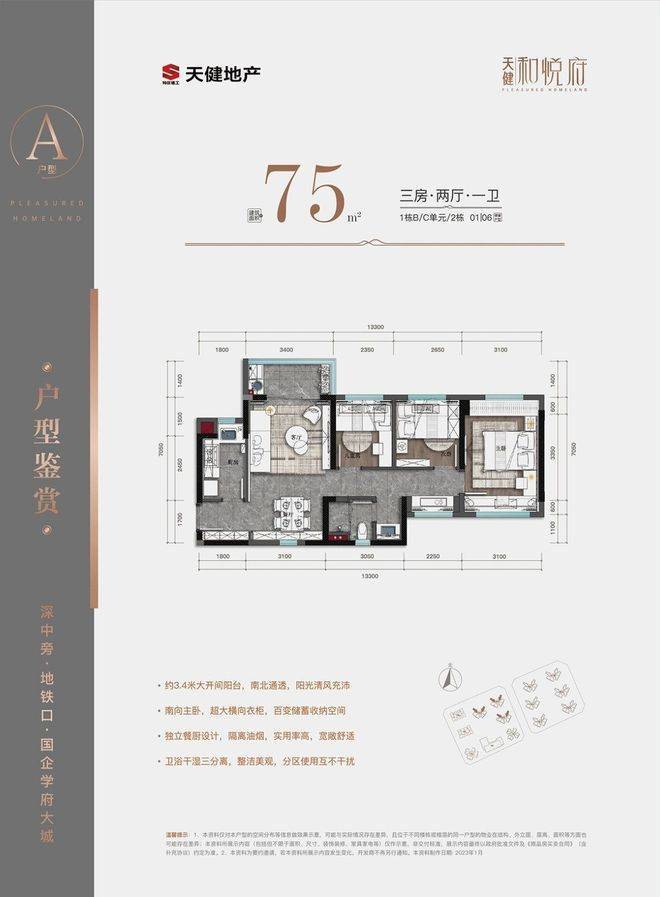 项目位于坪山区石井街道绿荫南路与达民路交汇处,地铁16号线石井站CD出口。项目占地面积:76218m²,建筑面积:328461m²,规划13栋高层住宅,总房源2833户,车位2600个,主力户型户75-99m²3房1-2卫,梯户比3梯6/7户,管理费3.8元/m²/月,物业公司为天健城市服务有限公司,学区范围深圳中学坪山创新学校、坪山外国语学校、坪山第二小学、深圳高级中学。周边生态环绕,园林面积约3.2万㎡,绿化率约40%。项目首期预计推出688套建面约75-99㎡3房精装户型,高使用率大尺度产品。