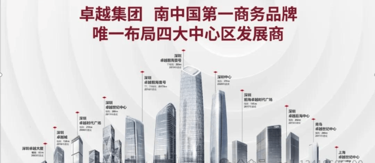 2005年,深圳卓越·时代广场作为深圳福田中心区地标,卓越集团首个商务地产品牌诞生,象征卓越正式进入CBD商办地产领域。至今为止,卓越致力打造城市最美天际线,在深圳开发及在建写字楼超40座,亦是唯一同时布局深圳福田中心区、后海中心区、前海中心区、宝安中心区四大中心区的商业地产开发商及运营商。