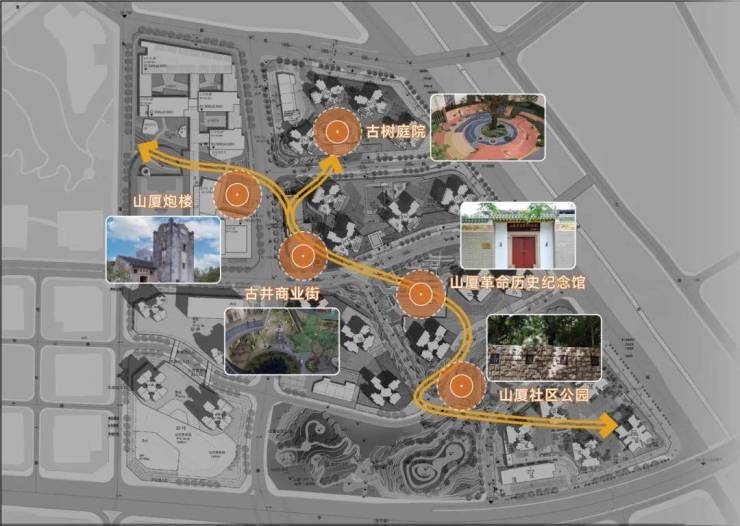 文脉传承将周边的古树、古炮楼、古井都保留下来,打造为特色文化区域,加上山厦历史纪念馆,形成独特的“文脉走廊”串联大城,融合成人文社区,下楼即享的全龄活力空间,多功能架空层、邻里活动空间,安放孩童欢笑与长者闲适。