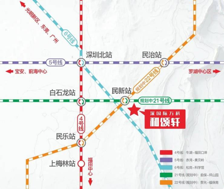 地铁-地铁线路密集: 1站深圳北,2站福田。4/5/6/21(规划中)/22(在建中)号线,5条地铁环绕;项目距离4号线白石龙站直线距离约600m,便捷通达;