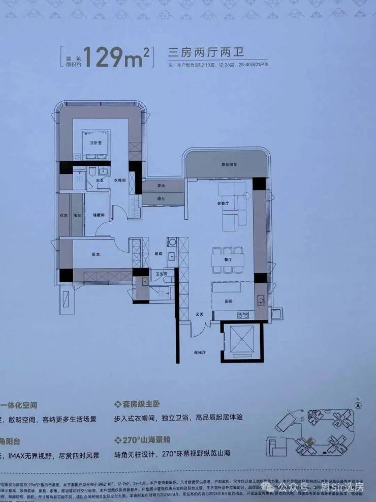 ☆建面约129㎡户型,得房率约105%(包含赠送),东北朝向看一线梧桐山景观。跟127㎡户型只差了2㎡,格局却千差万别。