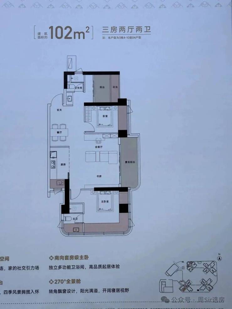 ☆建面约111㎡户型,得房率约94%(包含赠送),西北朝向看一线梧桐山景观。跟102㎡户型布局有点像,也是长条形……