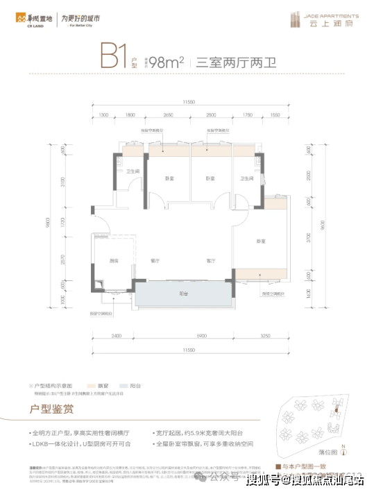 B1户型:横厅南北通透格局,客餐厅5.9米开间,得房率81.23%,阳台主朝东南向。