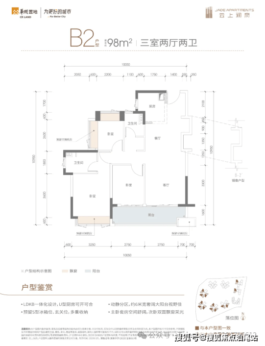 B2户型:经典竖厅格局,客厅3.45米开间,连接6.2米长的大阳台,得房率83.76%,西南、东南或西北向。