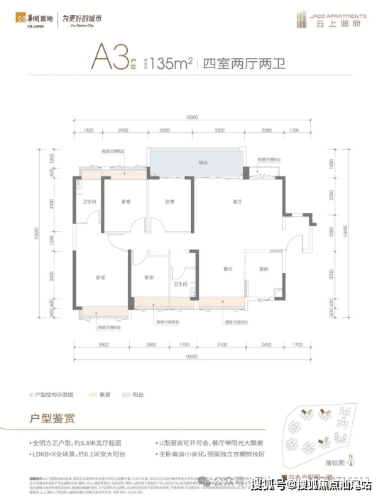 A3户型:竖厅超大宽厅格局,客厅5.8米开间,连接6.1米长的大阳台,主卧大套房设计,得房率83.65%,阳台主朝东北或西北向。