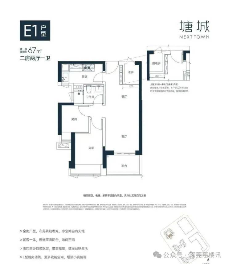 67㎡的2房2厅1卫,E1户型,5栋1单元02/03户型,设计的是竖厅格局,客厅3.15米开间,得房率约80%(包含赠送),东南朝向。