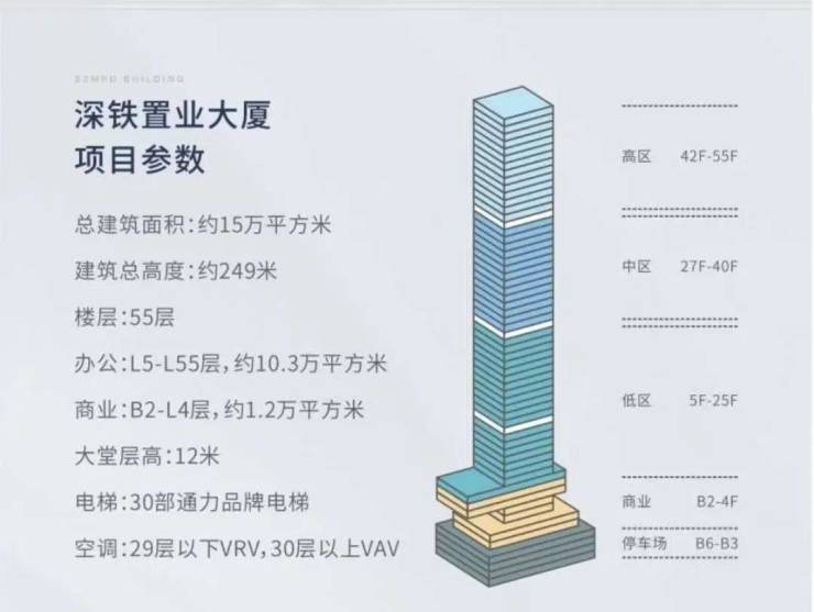 【甲级商务,品质典范】深铁置业大厦,注重品质,各项设计指标均达到甚至超越一般甲级标准。玻璃幕墙采用双层中空LOW-e玻璃幕墙,环保视野开阔;约12米双层通过大堂,20部国际品牌电梯速达目的楼层;4.4米标准层层高,8-10.2m进深,网络地板,方便实用。低区VRV高区VAV空调系统,满足企业多样化需求。物业部分已出租,投资自用皆宜。