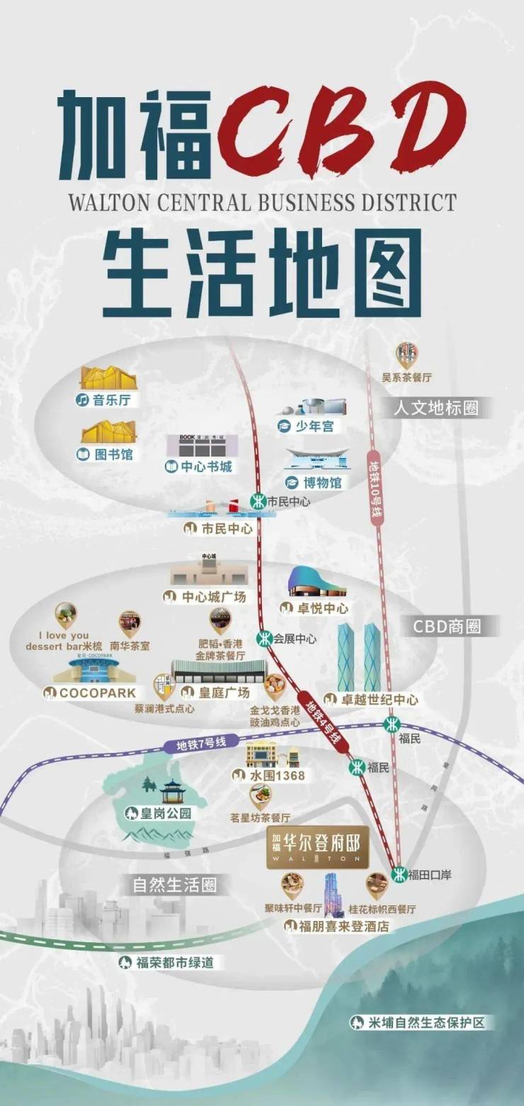 尽享福田CBD繁华版图,拥揽卓悦中心、卓越世纪中心、深圳中心城广场、COCOPAPK、皇庭广场等超级SHOPPING MALL。深圳的繁华商业步行街—水围文化商业街为邻,于传承老店里享受繁华慢时光。