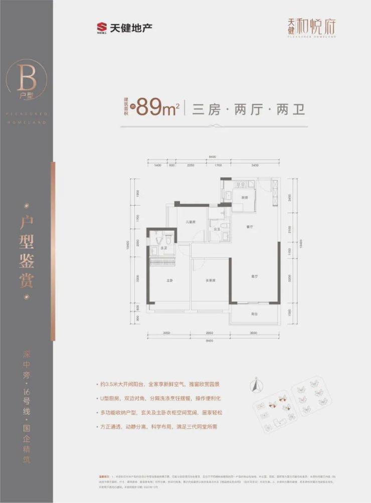 89m²的3房2厅2卫,折后总价219-228万西南东南朝向