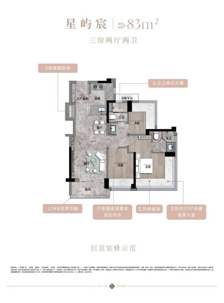 83㎡的3房2厅2卫,设计的是经典竖厅格局,客厅3.35米开间,LDKB一体化,S墙设计预留双开门冰箱卡槽位,三开间朝南,动静分区,分别做到了主卧16.02㎡/次卧9.08㎡/次卧7.01㎡(包含墙体飘窗),U型厨房,公卫三段式干湿分离,赠送1.98平设备平台,得房率约77.9%(不含赠送),套内面积64.28㎡,阳台5.02m²西南或东南朝向。亮点:83平做到了3房2卫,主卧270°无柱转角飘窗,厨房烟道外置+额外赠送设备平台,并且是纯南向格局。