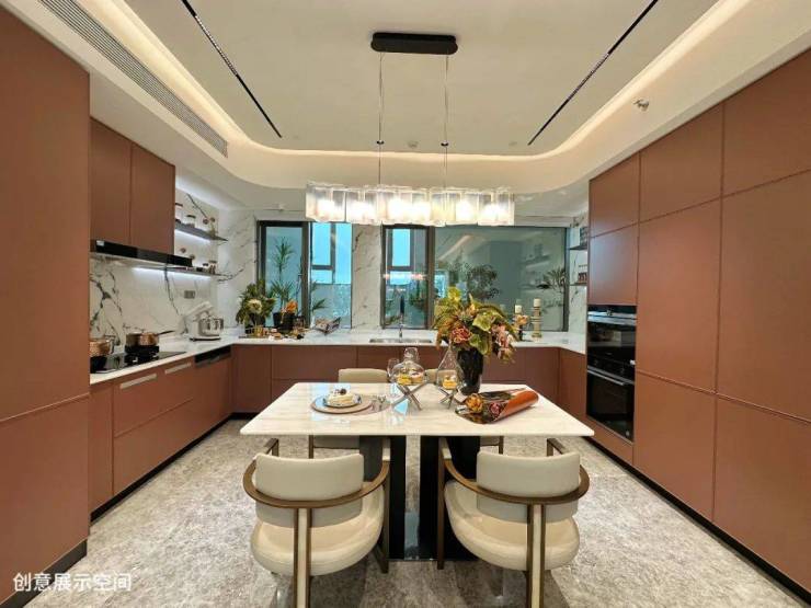 整个半开放式厨房简约明亮,兼顾了开放共享与社交的生活需求,大操作台面为家人提供共同烹饪之乐,预留宽敞的冰箱、烤箱位等,并配备隐藏式收纳。