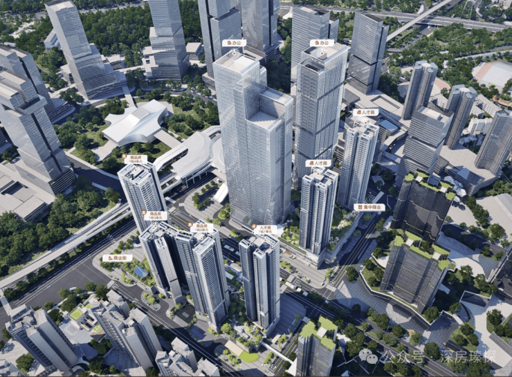 深铁阅云境广场,由深铁集团开发,总占地面积约5.6万㎡,总建筑面积52万㎡,计容建筑面积约11.2万㎡,容积率6.1,绿化率40%,其中北区共由4栋总高32-46层的住宅组成,包含3栋商品房+1栋人才房,其中1栋1单元人才房46F,1栋2单元商品房46F,1栋3单元商品房32F,1栋4单元商品房45F。