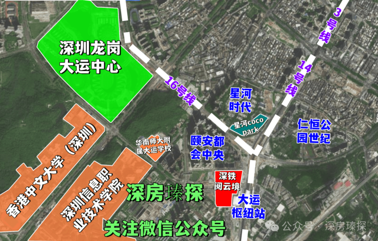深铁阅云境广场周边产业配套以高等教育和科技创新为核心,形成产学研深度融合的产业生态圈89。项目南侧紧邻大运AI小镇和软件小镇,已引入胜科纳米(半导体检测龙头)、天安数码城等产业载体,聚集超350家科技企业,涵盖AI、集成电路、生物医药等领域。依托香港中文大学(深圳)和深圳北理莫斯科大学等国际高校资源,片区拥有3家诺贝尔奖科学家实验室(如唐本忠院士的发光材料实验室、徐杨院士的基因组学实验室)和9个重点研究院,为项目提供了丰富的高端人才资源和创新氛围56。