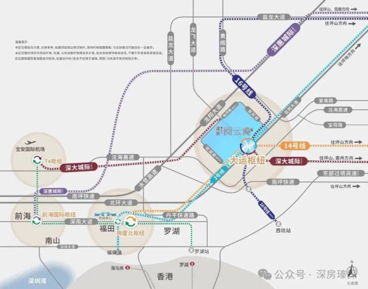 交通配套:深铁阅云境广场交通配套以"四线交汇"为核心优势,打造深圳东部最便捷的TOD交通网络 8920。项目位于大运枢纽站上盖,该枢纽是深圳东部最大的综合交通枢纽,集地铁3号线、14号线、16号线和深大城际(33号线)四线于一体,实现站内无缝换乘321。地铁3号线可直达罗湖(6站)、福田岗厦北(8站);14号线可快速到达福田中心区;16号线连接龙岗与坪山;深大城际预计2026年11月开通,可直达宝安T4枢纽(7站)和惠州大亚湾(需换乘)。