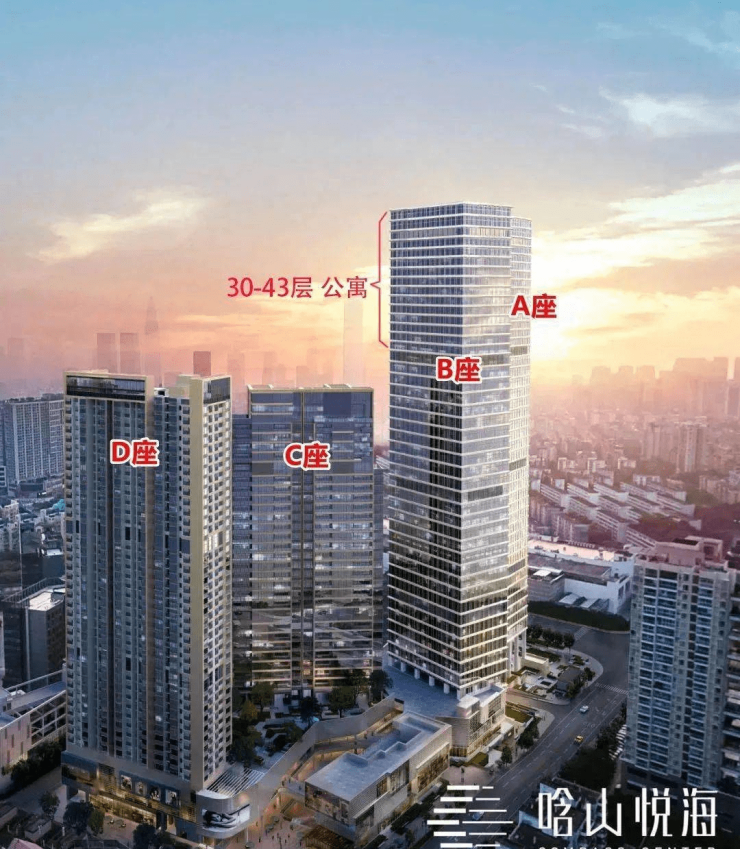 晗山悦海是12号线四海站地铁口物业,规划有2栋住宅,2栋办公公寓,共4栋产品。