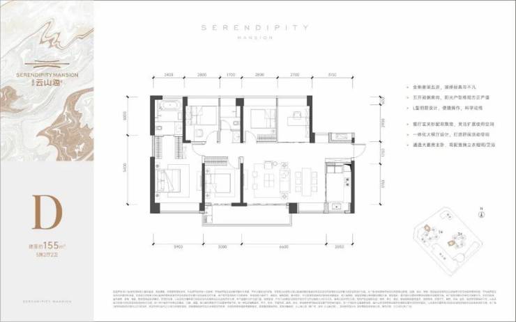155㎡的5房2厅2卫,设计的是横厅南北通透格局,客餐厅6.6米开间,客厅连接次卧出大阳台,五开间朝南,5个卧室分别为3.9米/3米/2.8米/2.8米/2.7米的宽度,U型厨房,公卫三段式分离,得房率:76.87%(不含赠送),阳台主朝东南或西南向。