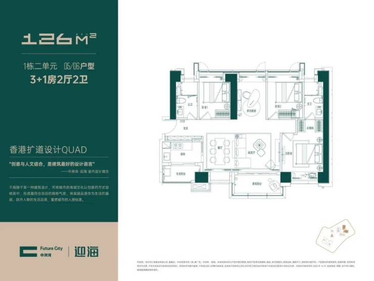 1栋2单元为61F高的为5梯6户设计,每层3.05米层高,有两种户型分别为01-04的126㎡传统三房二卫和126㎡的3+1房二卫横厅户型