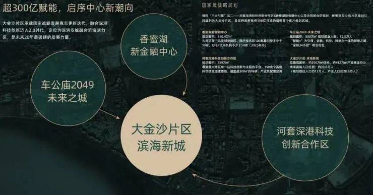 【政策倾斜 见未来】超300亿大金沙规划唯一接驳福田CBD和深圳湾的滨海新城,北邻香蜜湖新金融中心和车公庙2049未来之城,南接河套深港科创合作区,以政府资源的倾斜和前瞻的规划,成为最具生长力片区,主推福田CAZ转型。