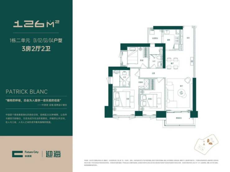 1栋2单元01/02/03/04户型为传统三房二卫户型,老实说126㎡做传统三房有点浪费空间,现在前海很多传统三房113㎡都能做到了。庆幸的是这个户型配备了双阳台和比较大的房间,主卧还有衣帽间,是传统三房里面的高级版。