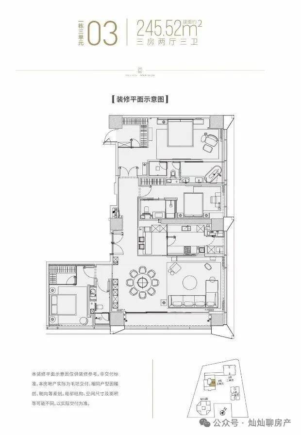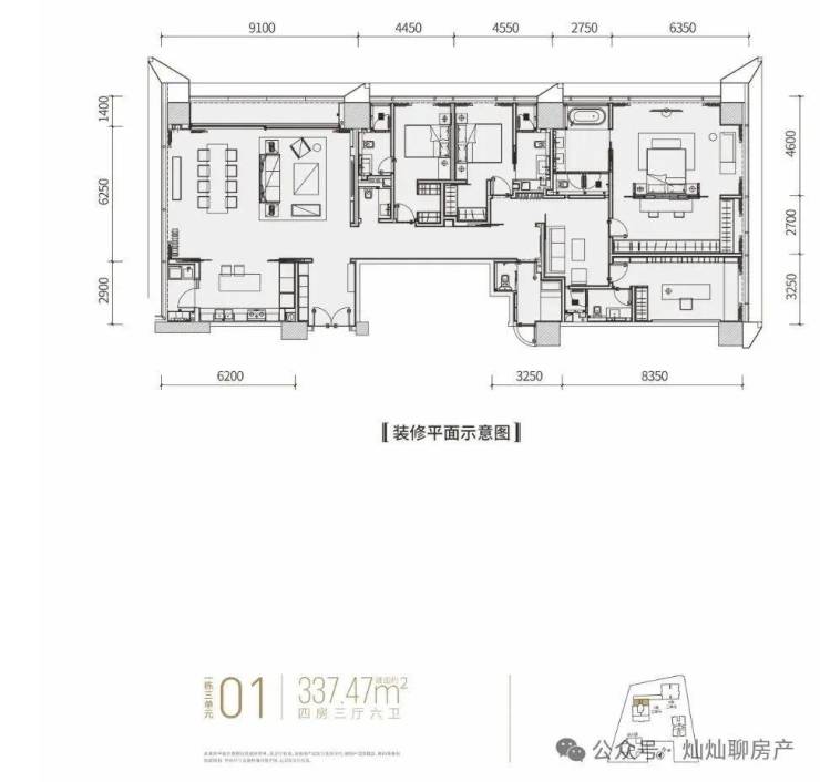 1栋三单元是酒店+商务公寓,22层以上为商务公寓,主力户型246-338㎡,均价约为9万元/㎡。