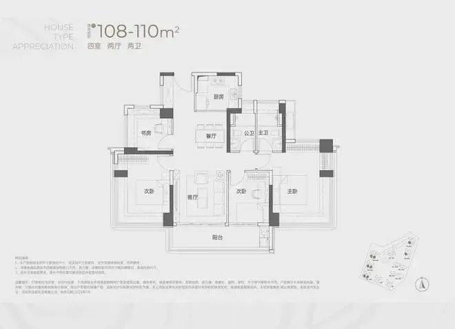 竖庭格局,西南向,基本居住功能与建面约108-110㎡4房2卫一致,但格局不一样,从目前公布的户型图上看,主要是主卧空间有了更大的提升,比如可以放更大一点的衣柜。但从位置上看,它所在的楼栋更靠近主干道,会有噪音影响。