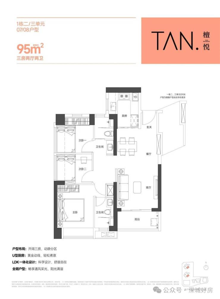 2. 95㎡的3房2厅2卫,设计的是竖厅格局,LKDB一体化设计,进门入户玄关,有1个次卧做的双飘窗,U型厨房,卫生间三段式分离,得房率:74.34%(不含赠送),全部东南朝向。