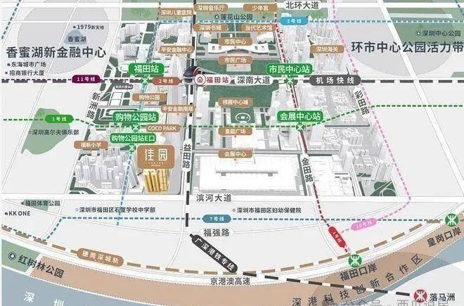 ◆ 7条地铁线环绕:1号线罗湖-机场、2号线莲塘-赤湾、3号线福保-双龙、4号线福田口岸-牛湖、7号线西丽湖-太安、10号线福田口岸-双拥街、11号线福田-碧头