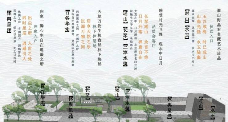 整个园林分为七个主题部分,分别为[水玉]、[时山]、[休舆星泽]、[长琴]、[瑶山]、[三淖水镜]、[百谷华实],都取自于《山海经》一文。