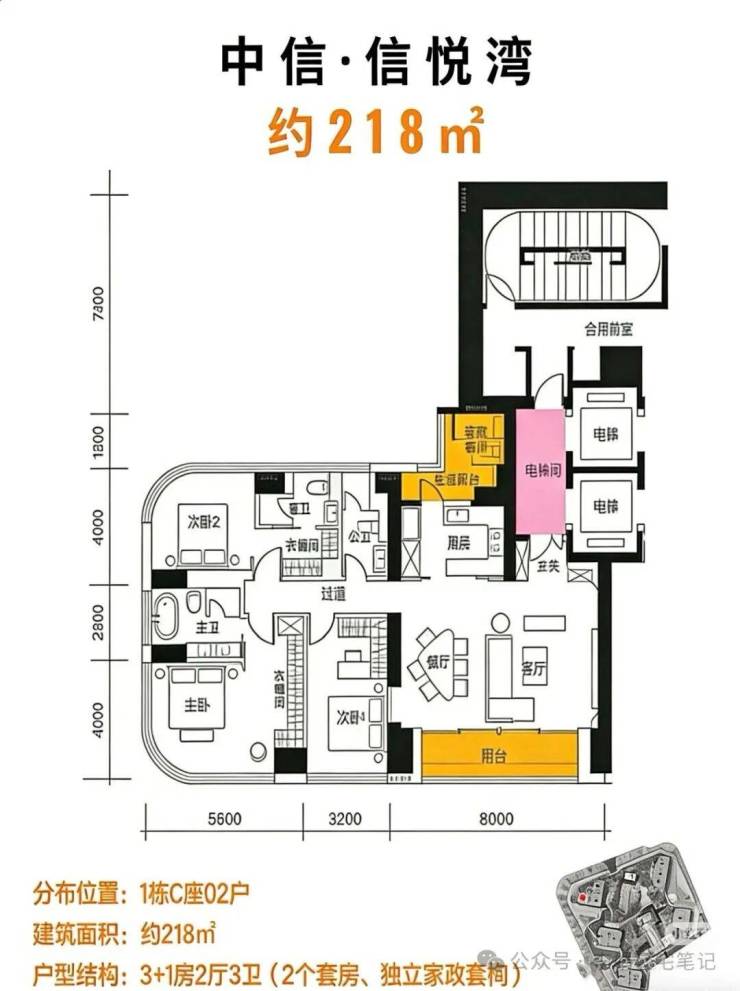 中信信悦湾项目B栋370㎡户型,是整个项目地段和朝向最好的产品,主打东南向看中心河跟永久无遮挡海景